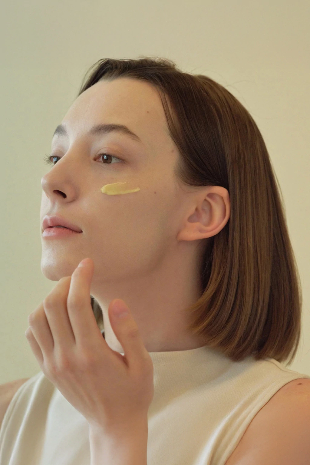 Aplicar una pequeña cantidad alrededor del contorno de ojos, dando golpecitos suaves hasta absorber.